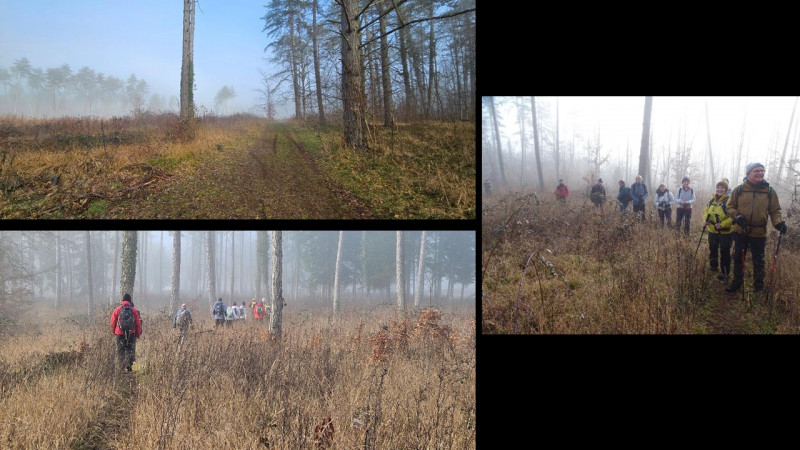 Temps frais et brumeux au départ de cette randonnée, près du domaine de Sainte Anne, au dessus de Messigny. Certains vestiges datent de l'époque où ce site était une colonie de vacances des potasses d'Alsace (lire les commentaires dans le diaporama d'Alain). Le sentier en pente douce part dans la forêt et surplombe la vallée du Suzon au dessus de la combe de Lambrun. Le temps brumeux ne permet pas de profiter des points de vue. On passe ensuite près de l'ancienne ferme de La Motte, avec des corps de batiments importants, malheureusement à l'abandon. Puis l'éperon barré de Roche Chateau qui domine la vallée du Suzon. Le chemin descend dans la combe d'Arvaux, puis remonte la Combotte. On rejoint le point de départ proche de Sainte Anne par un sentier qui domine la combe d'Arvaux. Avant de se séparer, quelques bouteilles et friandises pour fêter l'anniversaire de Michel, au son de la trompe de chasse trouvée par Pascal...