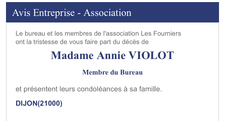 C'est avec une grande tristesse que nous avons appris le décès d'Annie VIOLOT, survenu le 6 février 2020.